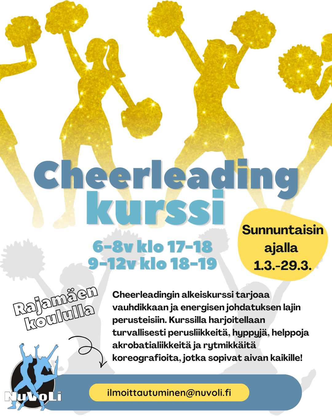 Cheerleadingin alkeiskurssi tarjoaa vauhdikkaan ja energisen johdatuksen lajin perusteisiin. Kurssilla harjoitellaan turvallisesti perusliikkeitä, hyppyjä, helppoja akrobatialiikkeitä ja rytmikkäitä…